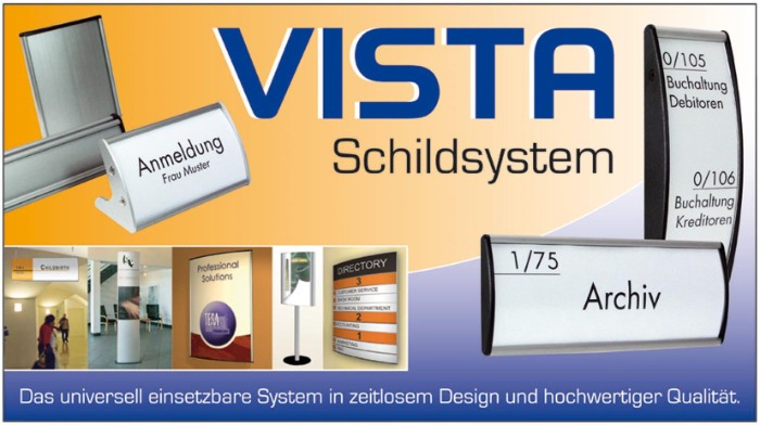 Zeitloses Design und robuste Ausführung, kennzeichnen das Vista-Schildsystem. Für Büro- und Wegekennzeichnung hervorragend geeignet.